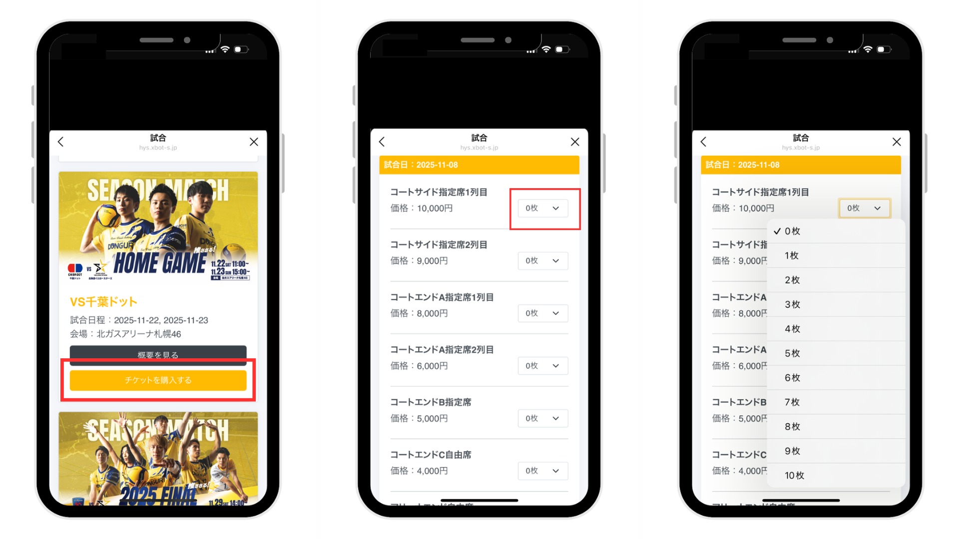 ⑧試合当日は購入履歴より指定の試合日のQRコードをご提示ください。