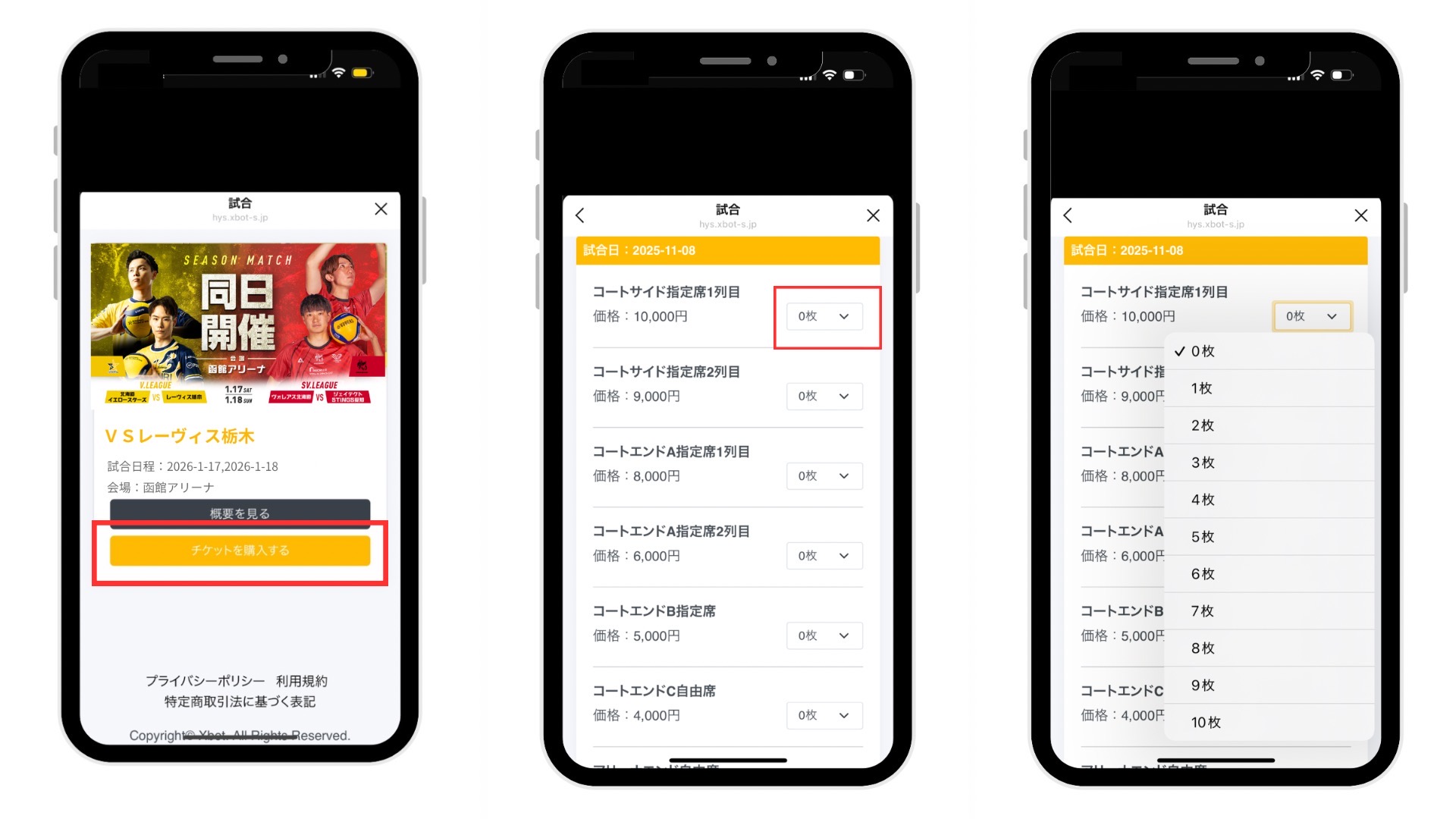 ④ご希望の観戦日程より座席種別を選択(指定席の場合は枚数に応じてご希望の座席をご選択ください)