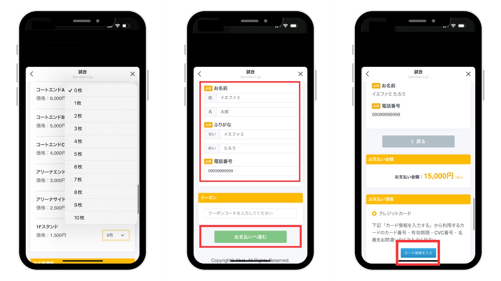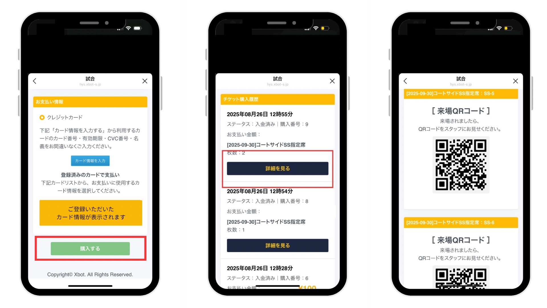 ⑧試合当日は購入履歴より指定の試合日のQRコードをご提示ください。