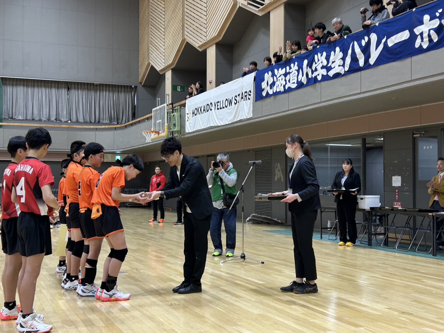 2026年1月10日~12日の3日間、北海道江別市の道立野幌総合運動公園総合体育館を会場に、 北海道イエロースターズと一般社団法人 北海道バレーボール協会、江別バレーボール協会が主催する 「第42回北海道小学生バレーボール選抜優勝大会」が行われました。 本大会は、北海道内の各地の予選を勝ち抜いたチームが一堂に会する大会であり、 男子の部、女子の部、混合の部の各12チームが参加し、北海道一の座をかけて挑みました。 表彰式では弊社代表取締役社長の澤野佑介が賞状・トロフィーなどを手渡しました。 北海道イエロースターズは大会のさらなる発展と、小学生の健やかな成長、 バレーボールの魅力発信に寄与してまいります。