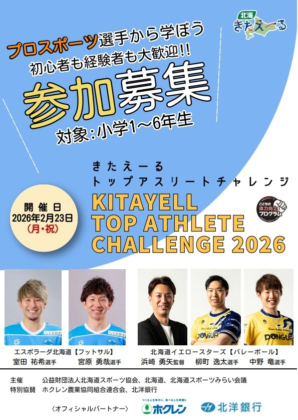 「きたえーるトップアスリートチャレンジ」に、バレーボールの講師として、浜崎勇矢監督・柳町逸太選手・中野竜選手が参加いたします。