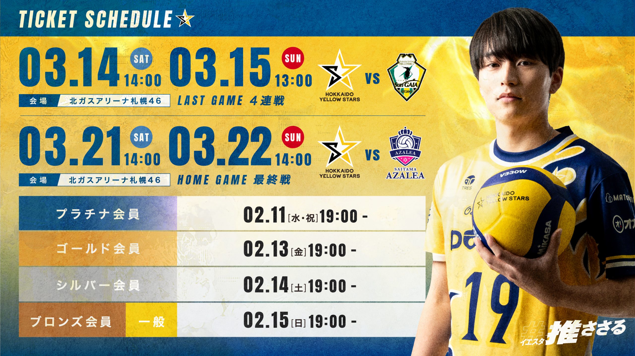 いつも北海道イエロースターズに温かいご声援、誠にありがとうございます。 2026年3月14日㈯-15日㈰ VS つくばユナイテッド Sun GAIA(@北ガスアリーナ札幌46) 2026年3月21日㈯-22日㈰ VS 埼玉アザレア(@北ガスアリーナ札幌46) 北ガスアリーナ札幌46にて開催される、北海道イエロースターズ ホームゲームのチケット販売スケジュールとなります。座席図・チケット価格や詳細等につきましては近日中にお知らせいたします。 2026年、最後の4連戦・ホームゲーム🔥 北ガスアリーナ札幌46でお待ちしております‼
