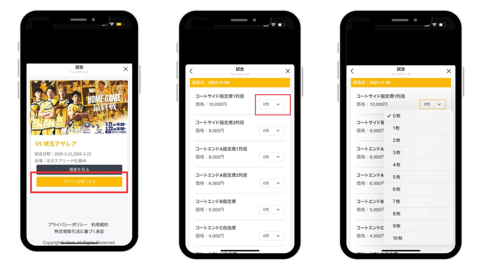 ④ご希望の観戦日程より座席種別を選択(指定席の場合は枚数に応じてご希望の座席をご選択ください)